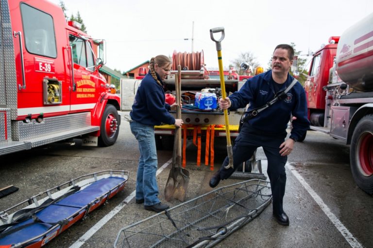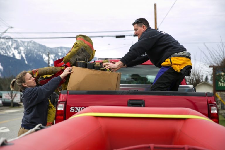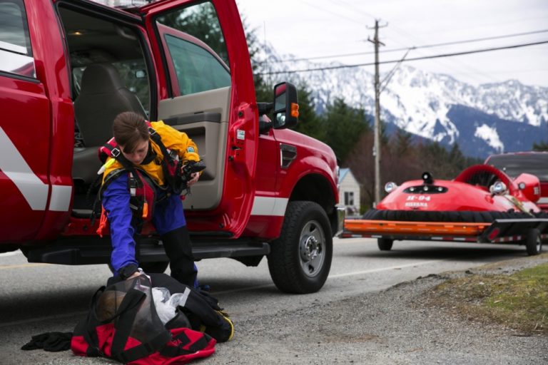 Záchranári prehľadávajú trosky domov v oblasti neďaleko mestečka Arlington v americkom štáte Washington, ktorú postihli zosuvy pôdy. Foto: SITA/AP