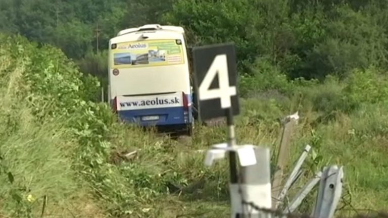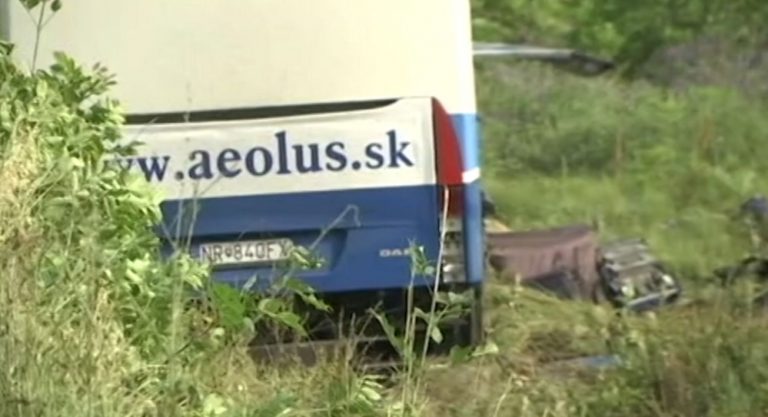 Miesto havárie autobusu pri meste Aleksinac v Srbsku. Autobus s turistami sa vracal z gréckeho ostrova Korfu a na diaľnici Niš - Belehrad neďaleko dedinky Bobovište zišiel z cesty a prevrátil sa. Bolo v ňom 29 cestujúcich a dvaja vodiči. Srbsko, Aleksinac, 21. jún 2016. Foto: SITA/AP