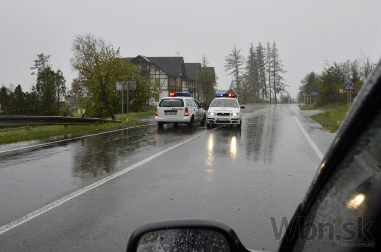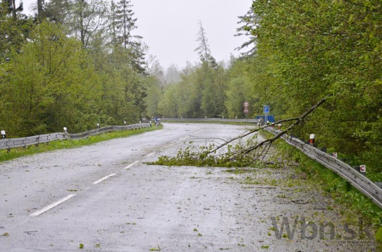 Divoké počasie sužuje oblasť severného Slovenska. Vietor láme stromy, ktoré končia priamo na cestách, niektoré dokonca už zasiahli aj autá. Na snímke: Uzavretá cesta na Vyšné Hágy a Štrbské Pleso v Tatranskej Polianke. Vysoké Tatry, 15. máj 2014. Foto: SITA/Radoslav Maťaš
