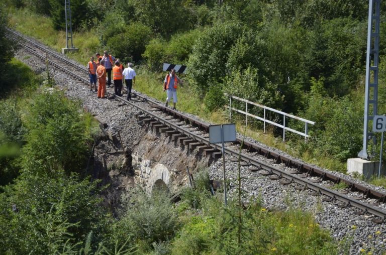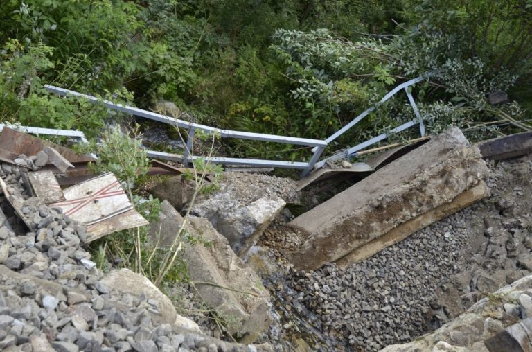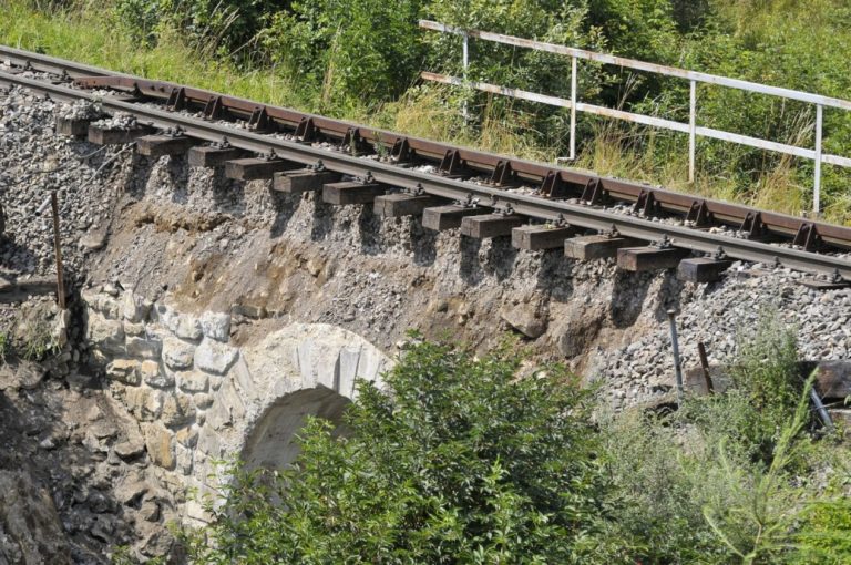 Zrútená časť betónového mosta z roku 1910 na trase Tatranskej elektrickej železnice medzi Tatranskou Poliankou a Novou Poliankou. Poškodený bol takzvaný parapet mosta, mostná klenba ostala celá. Tatranská Polianka, 5. august 2016. Foto: SITA/Radoslav Maťaš