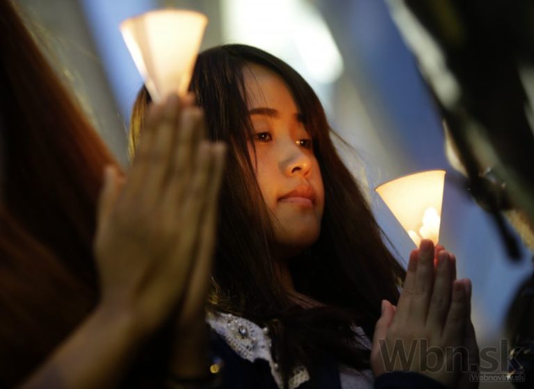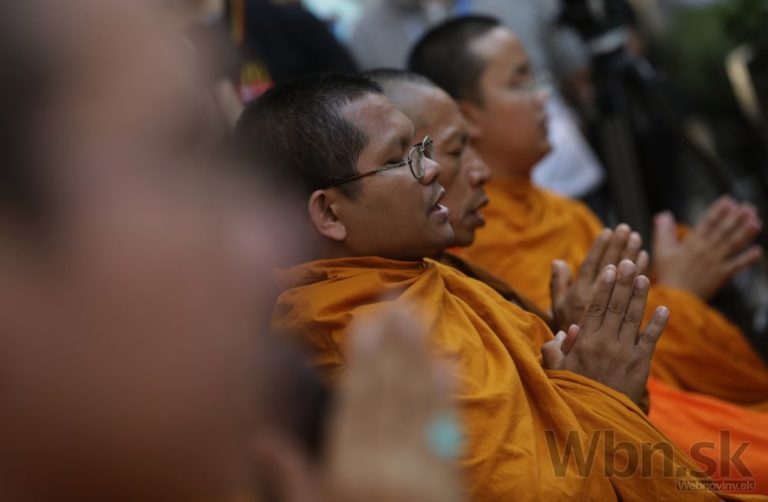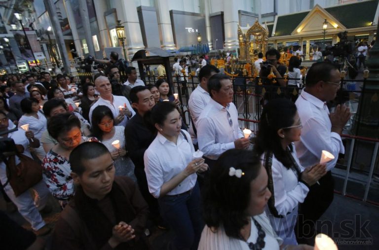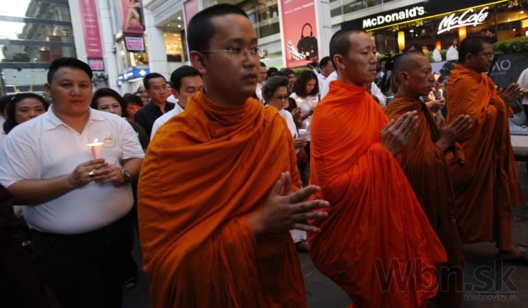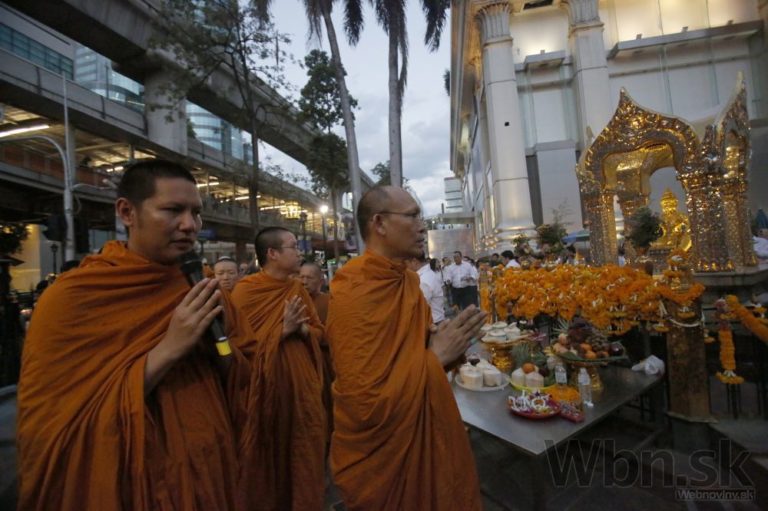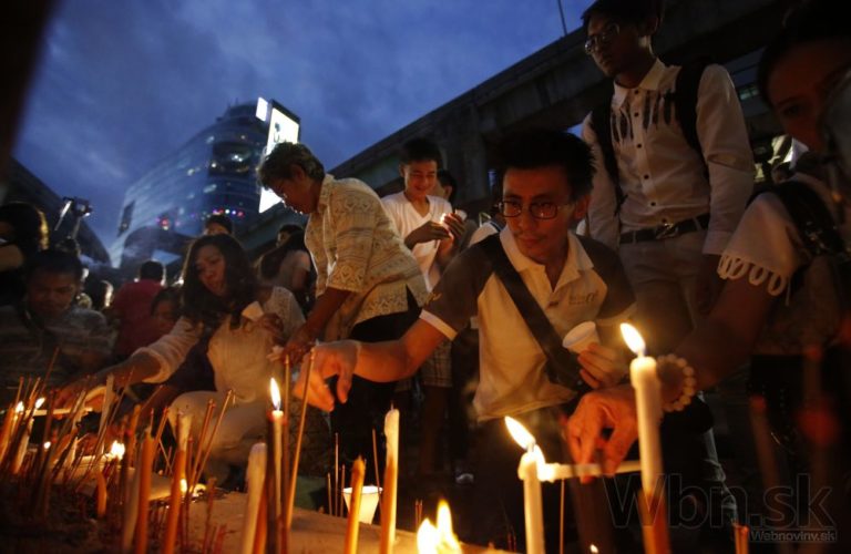 Pri svätyni v centre Bangkoku sa zhromaždil dav a minútou ticha si pripomenul chvíľu, keď explodovala bomba. Modlitby viedli budhistickí mnísi a diváci držali v rukách zapálené sviečky na pamiatku najkrvavejšieho útoku v novodobých dejinách Thajska. Foto: SITA/AP