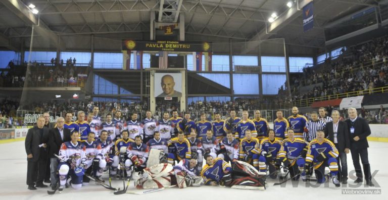 Mužstvo St. Louis Blues Alumni počas exhibičného duelu na počesť pred necelými tromi rokmi tragicky zosnulého Pavla Demitru. Trenčín, 22. august 2014. Foto: SITA/Tomáš Somr