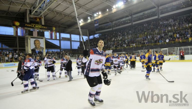 Mužstvá Slovak Stars a St. Louis Blues Alumni po skončení exhibičného duelu na počesť pred necelými tromi rokmi tragicky zosnulého Pavla Demitru. Trenčín, 22. august 2014. Foto: SITA/Tomáš Somr