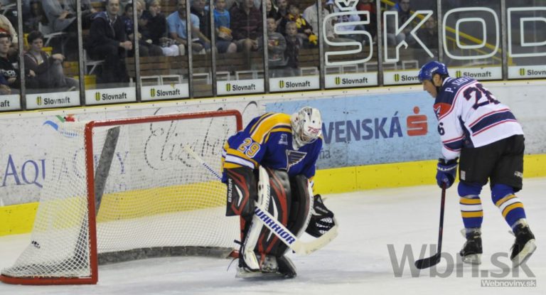 Sprava: Peter Štastný z mužstva Slovak Stars a Paul Štastný z mužstva St. Louis Blues Alumni počas exhibičného duelu medzi Slovak Stars - St. Louis Blues Alumni na počesť pred necelými tromi rokmi tragicky zosnulého Pavla Demitru. Trenčín, 22. august 2014. Foto: SITA/Tomáš Somr