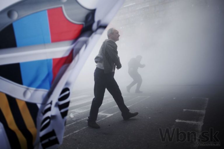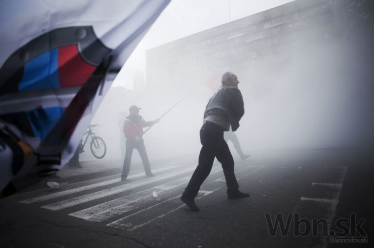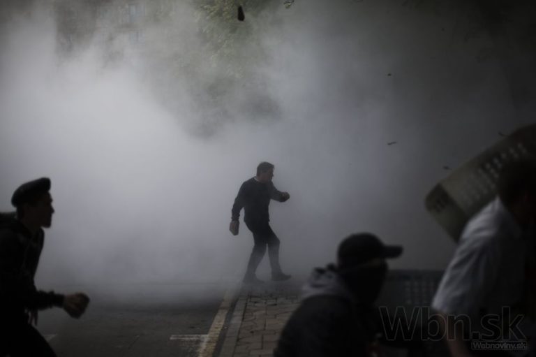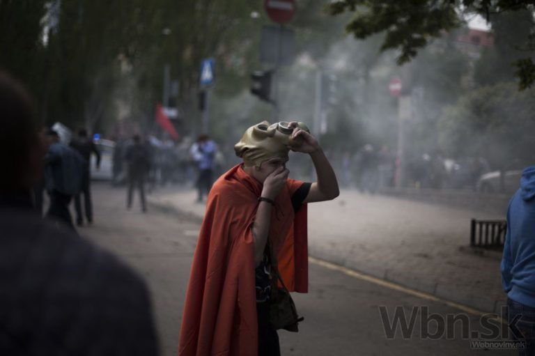 Proruskí aktivisti utekajú pred slzným plynom po zrážke s políciou pred budovou prokuratúry. Ukrajina, Doneck, 1. mája 2014. Foto: SITA/AP