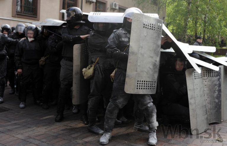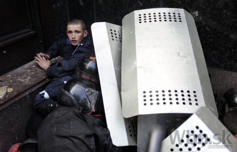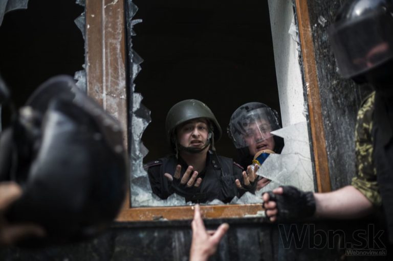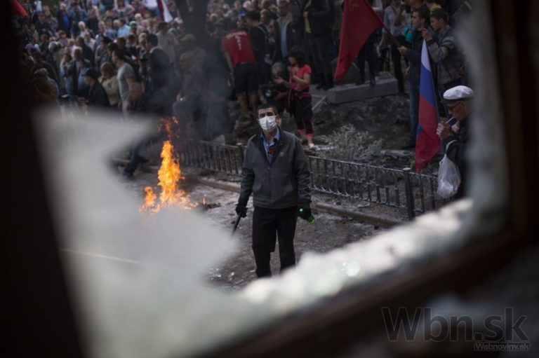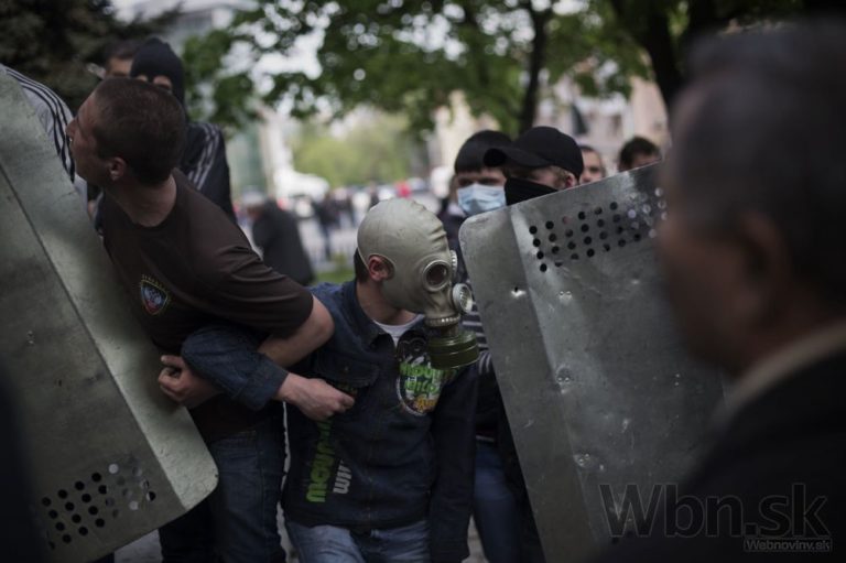 Proruskí aktivisti obsadili v piatok 1. mája ďalšie vládne budovy, tentoraz v Donetsku. Počas protestov došlo k zrážke s políciou a mnohí ľudia sa zranili. Foto: SITA/AP