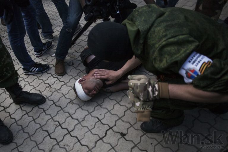 Zranený proruský aktivista leží na zemi po zrážke s políciou pred budovou prokuratúry. Ukrajina, Doneck, 1. mája 2014. Foto: SITA/AP