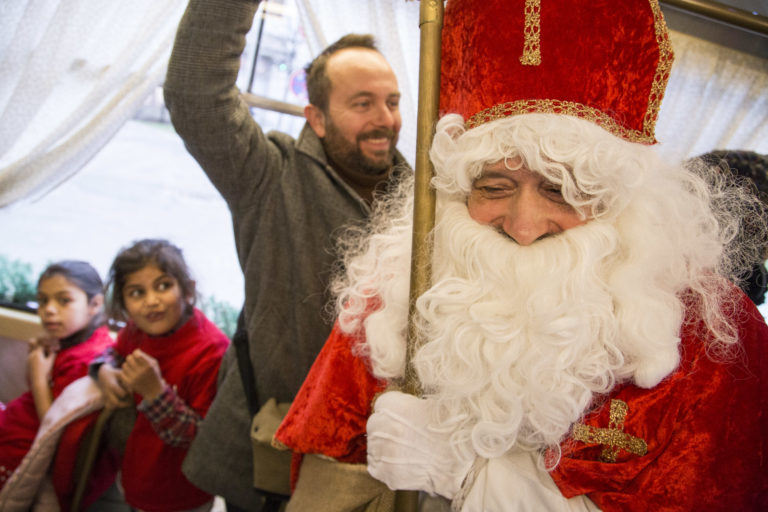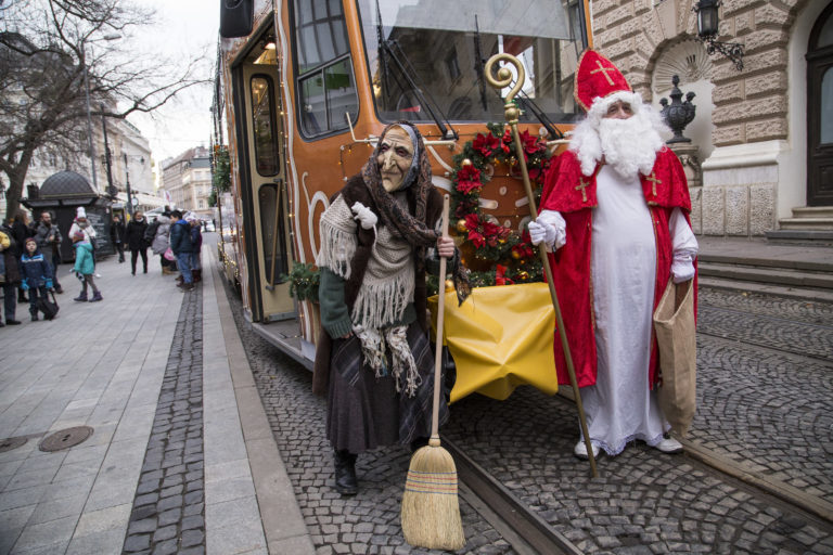 Svätý Mikuláš počas vypravenia vysvietenej vianočnej električky do ulíc Bratislavy. Bratislava, 6. december 2017. Foto: SITA/Branislav Bibel.