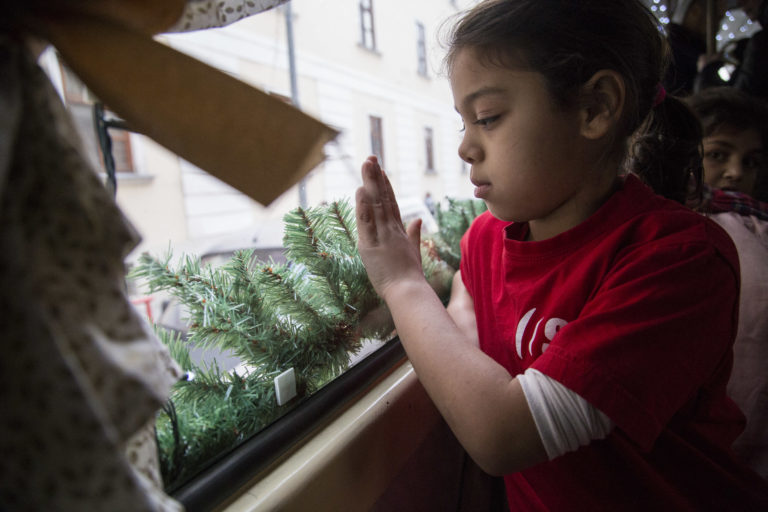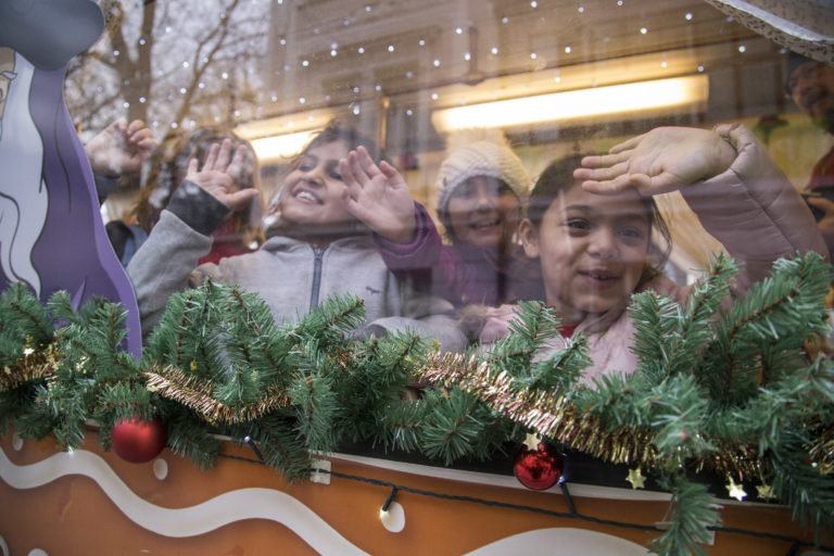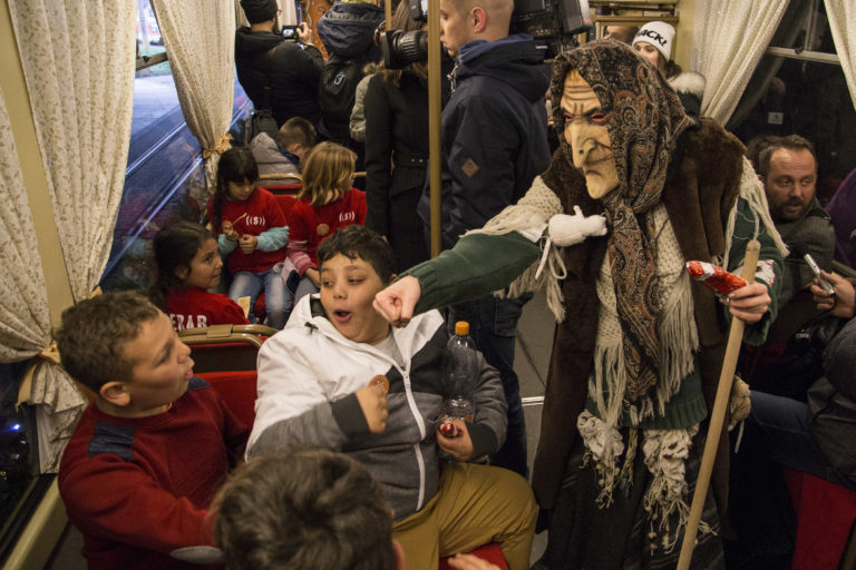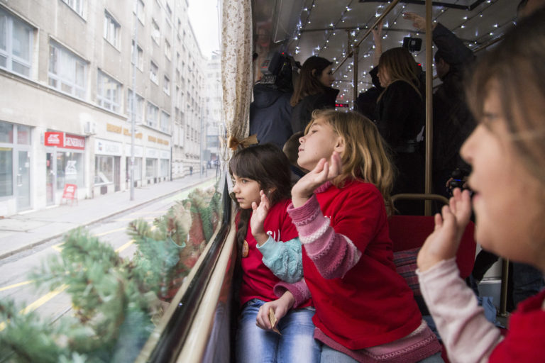 Deti počas vypravenia vysvietenej vianočnej električky do ulíc Bratislavy. Bratislava, 6. december 2017. Foto: SITA/Branislav Bibel.