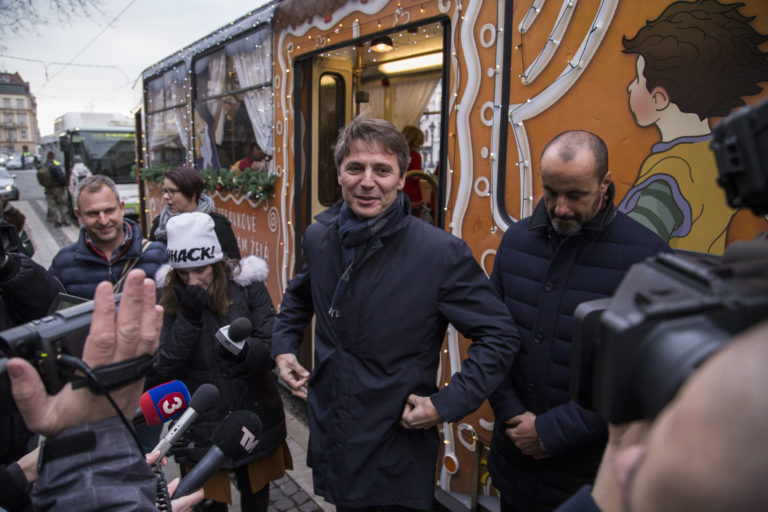 Primátor Bratislavy Ivo Nesrovnal (uprostred) počas vypravenia vysvietenej vianočnej električky do ulíc Bratislavy. Bratislava, 6. december 2017. Foto: SITA/Branislav Bibel.