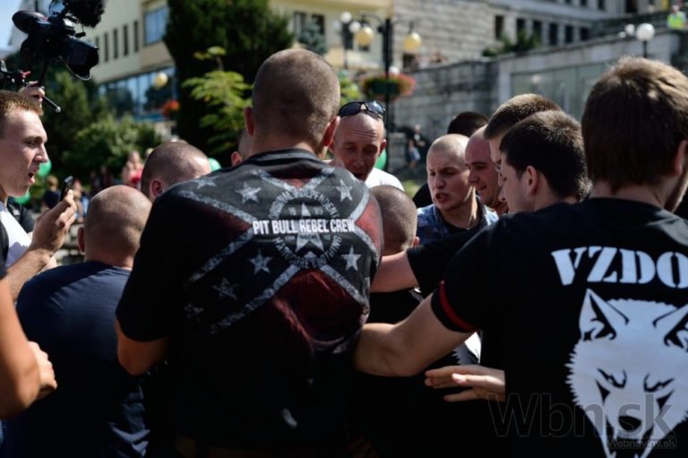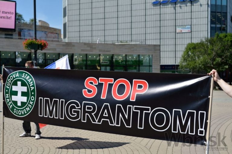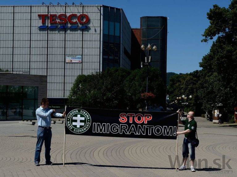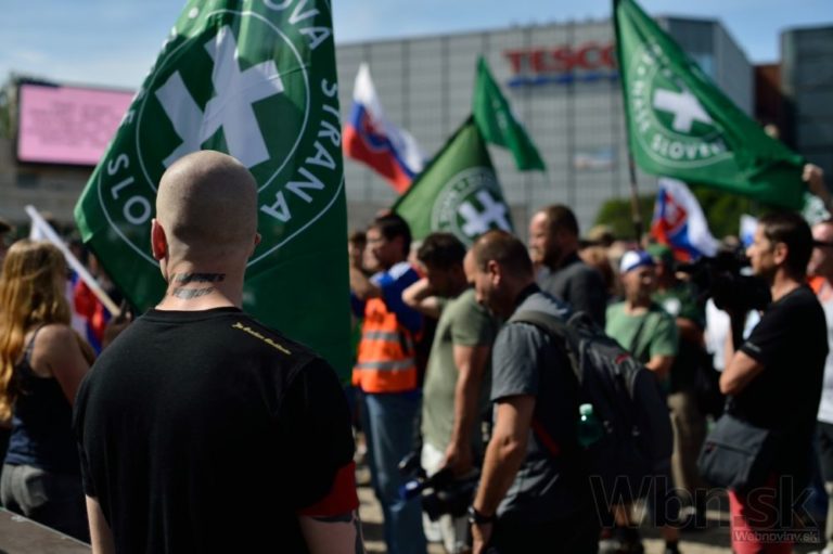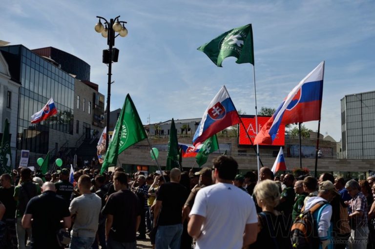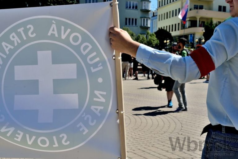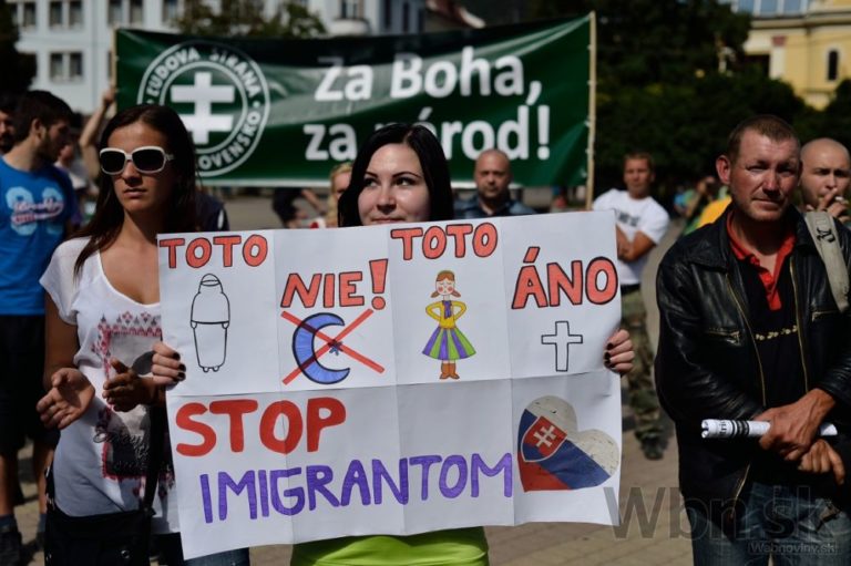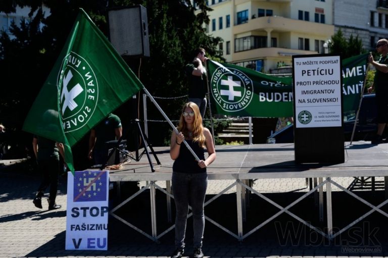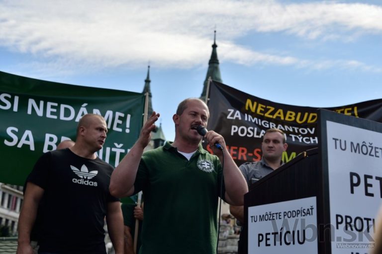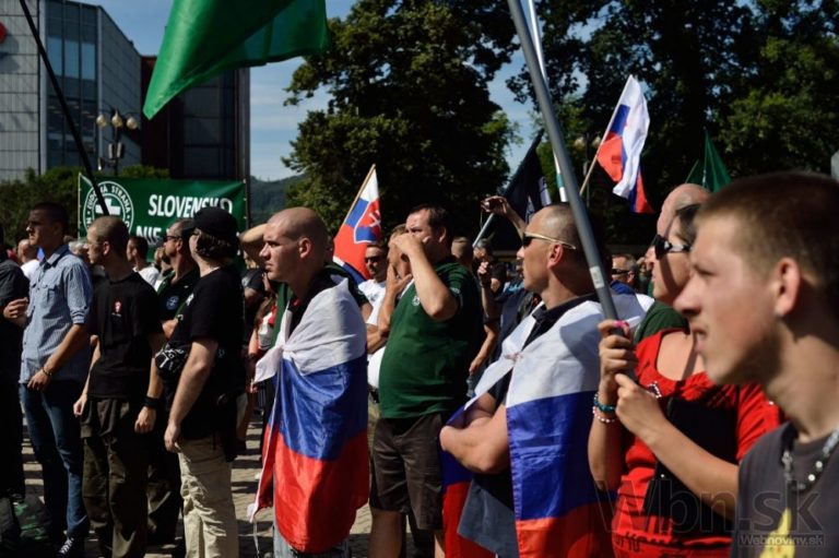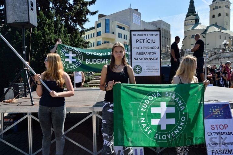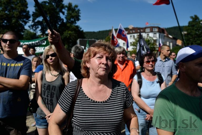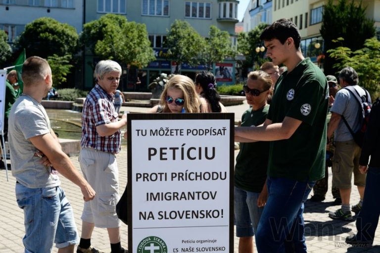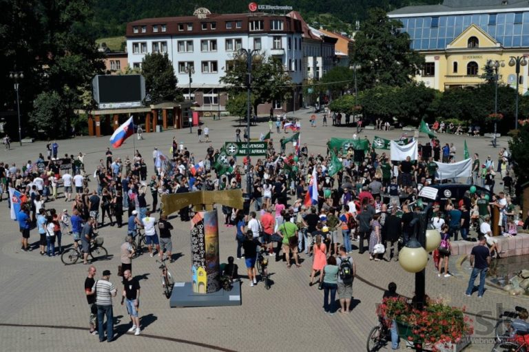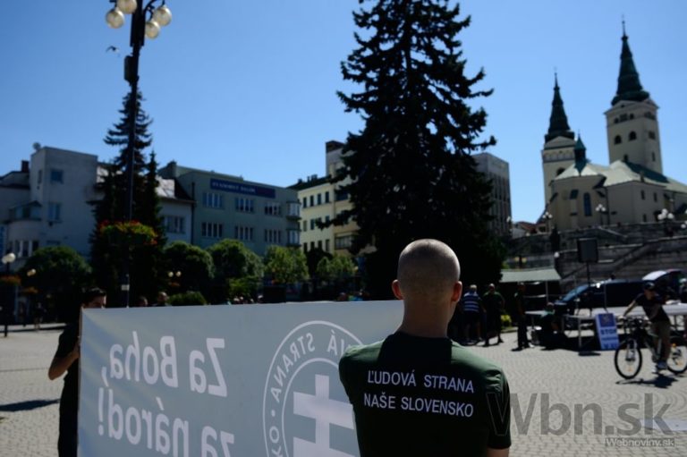 Protestné zhromaždenie proti utečencom, islamizácii a politike Európskej únie, ktoré zorganizovala Ľudová strana Naše Slovensko na Námestí Andreja Hlinku. Žilina, 11. júl 2015. Foto: SITA/Robert Tappert