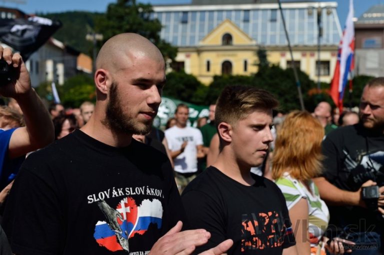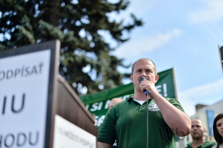 Líder ĽSNS a predseda BBSK Marian Kotleba počas protestného zhromaždenia proti utečencom, islamizácii a politike Európskej únie, ktoré zorganizovala Ľudová strana Naše Slovensko (ĽSNS) na Námestí Andreja Hlinku. Žilina, 11. júl 2015. Foto: SITA/Robert Tappert