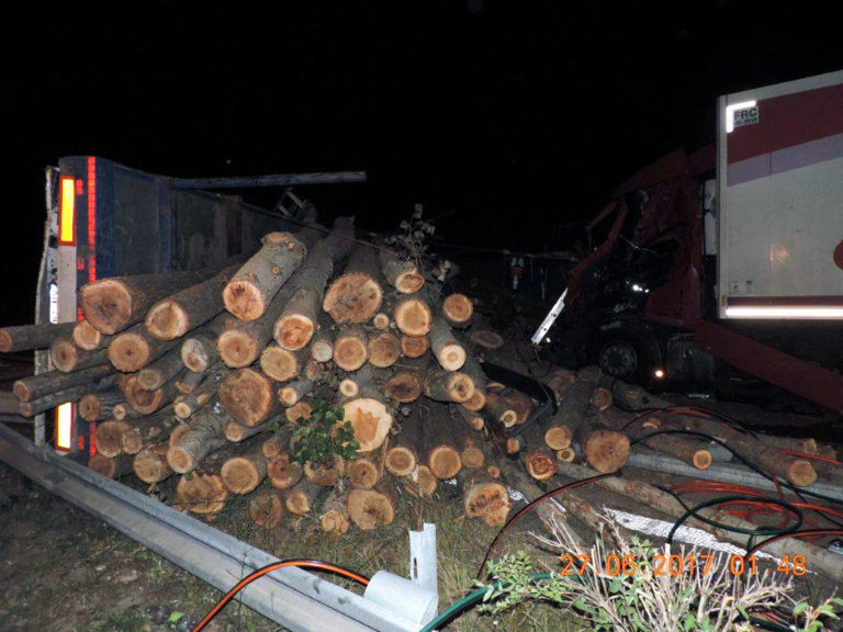 Havarovaný kamión s drevom zablokoval premávku na R1. Žarnovica, 27. jún 2017. Foto: SITA/KR PZ BB
