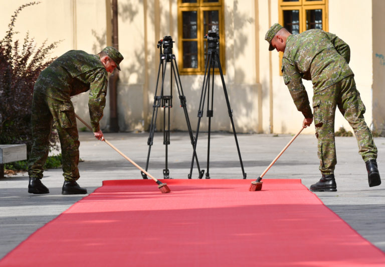 Vojaci pripravujú priestor pred historickou budovou Národnej rady SR pred začatím Veliteľského zhromaždenia náčelníka Generálneho štábu Ozbrojených síl (OS) SR. Bratislava, 7. júl 2022. Foto: SITA/Martin Medňanský