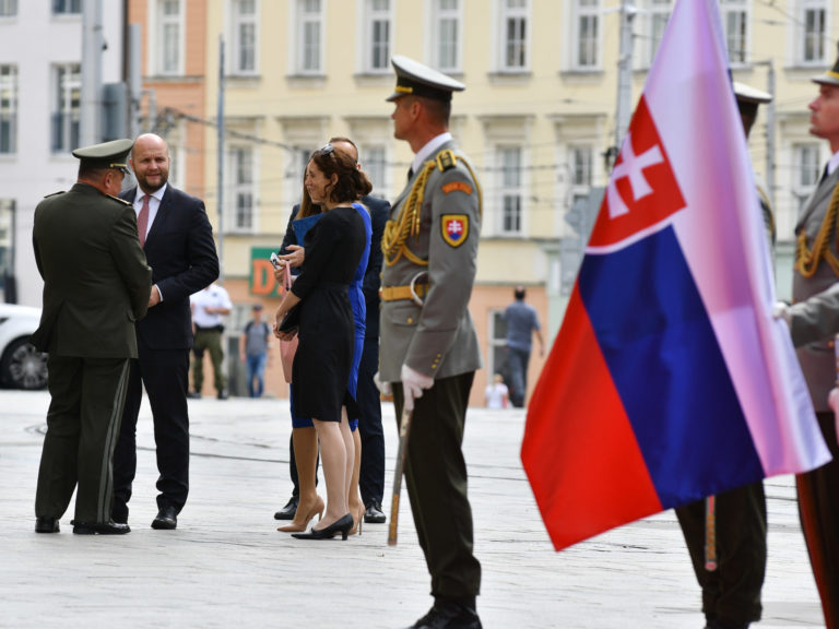 Uprostred sprava: Prezidentka SR Zuzana Čaputová a minister obrany SR Jaroslav Naď počas úplných vojenských pôct pri príležitosti Veliteľského zhromaždenia náčelníka Generálneho štábu Ozbrojených síl (OS) SR v priestoroch historickej budovy Národnej rady SR. Bratislava, 7. júl 2022. Foto: SITA/Martin Medňanský