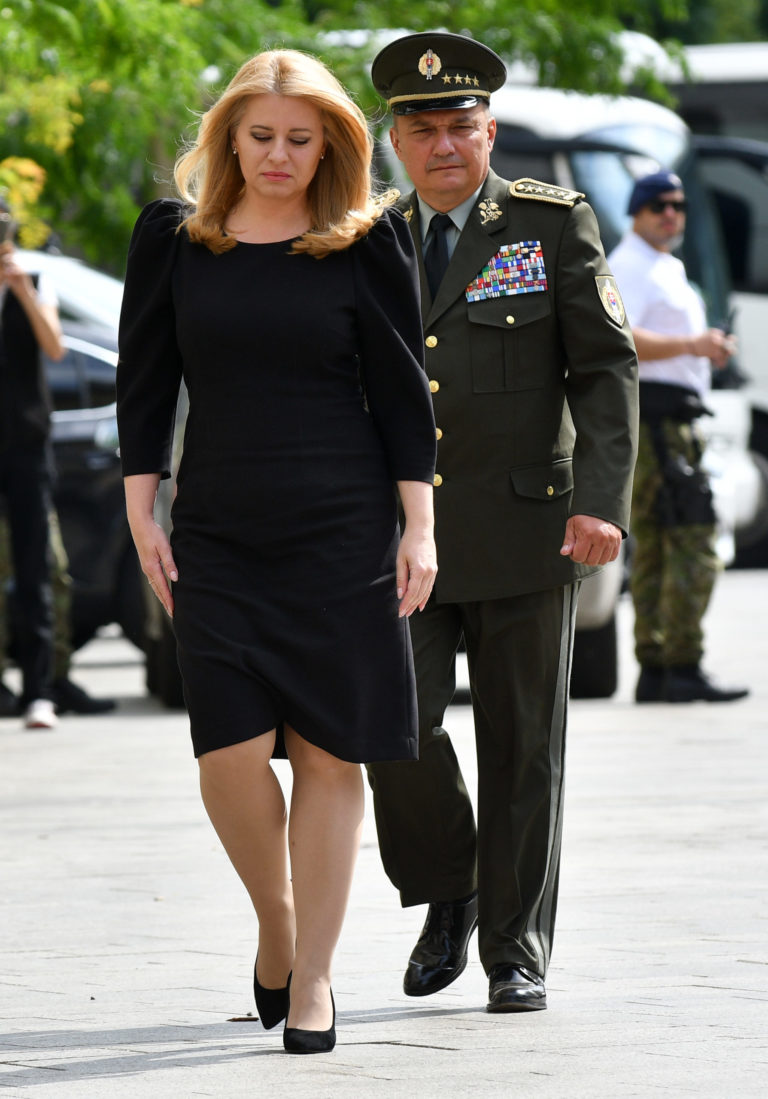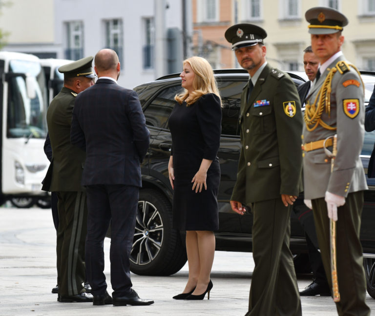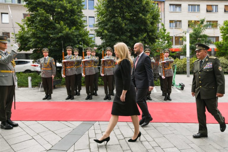 Zľava: Prezidentka SR Zuzana Čaputová a náčelník Generálneho štábu OS SR Daniel Zmeko počas príchodu pred začatím Veliteľského zhromaždenia náčelníka Generálneho štábu Ozbrojených síl (OS) SR v priestoroch historickej budovy Národnej rady SR. Bratislava, 7. júl 2022. Foto: SITA/Martin Medňanský