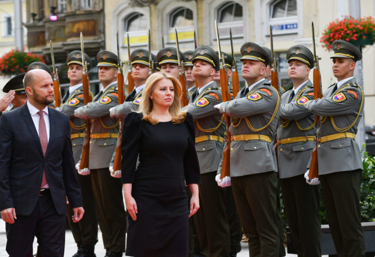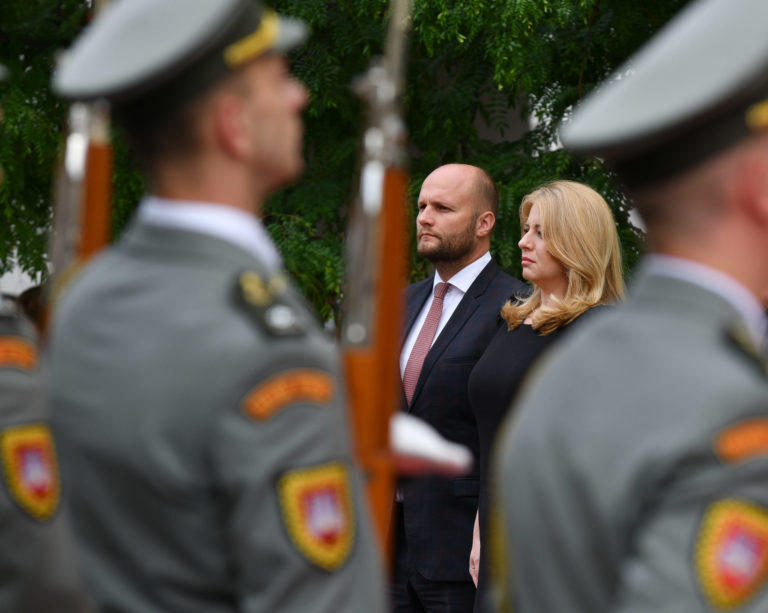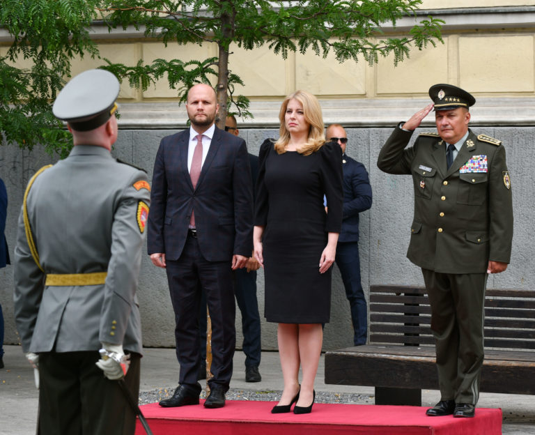 Sprava: Prezidentka SR Zuzana Čaputová a minister obrany SR Jaroslav Naď počas úplných vojenských pôct pri príležitosti Veliteľského zhromaždenia náčelníka Generálneho štábu Ozbrojených síl (OS) SR v priestoroch historickej budovy Národnej rady SR. Bratislava, 7. júl 2022. Foto: SITA/Martin Medňanský