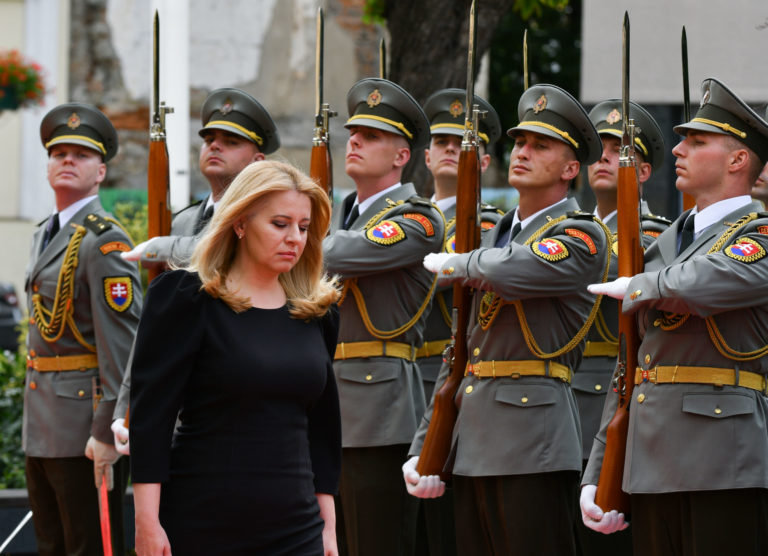 Prezidentka SR Zuzana Čaputová (v popredí) a Čestná stráž OS SR počas úplných vojenských pôct pri príležitosti Veliteľského zhromaždenia náčelníka Generálneho štábu Ozbrojených síl (OS) SR v priestoroch historickej budovy Národnej rady SR. Bratislava, 7. júl 2022. Foto: SITA/Martin Medňanský