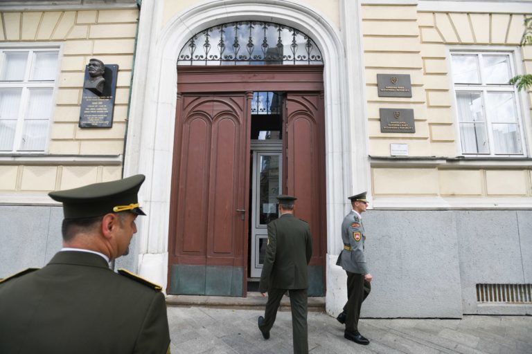 Zľava: Náčelník Generálneho štábu OS SR Daniel Zmeko a minister obrany SR Jaroslav Naď počas príchodu pred začatím Veliteľského zhromaždenia náčelníka Generálneho štábu Ozbrojených síl (OS) SR v priestoroch historickej budovy Národnej rady SR. Bratislava, 7. júl 2022. Foto: SITA/Martin Medňanský