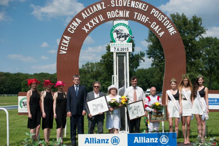 Uprostred zľava: Viceprezident Allianz - Slovenskej poisťovne Viktor Cingel, majiteľ koňa Miroslav Piskla s manželkou, tréner Pavel Kalaš a víťaz ceny Allianz - Slovenskej poisťovňe - 24. Cena Arvy (rovina 1800 m) džokej Zdenko Šmída počas 7. mítingu sezóny XXXVII. ročníka Turf-gala. Bratislava, 7. jún 2015. Foto: SITA/Robert Tappert