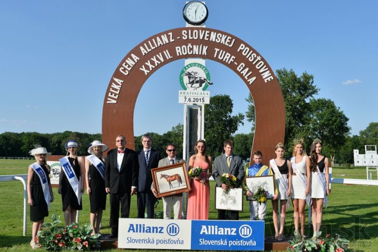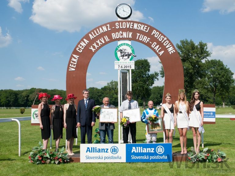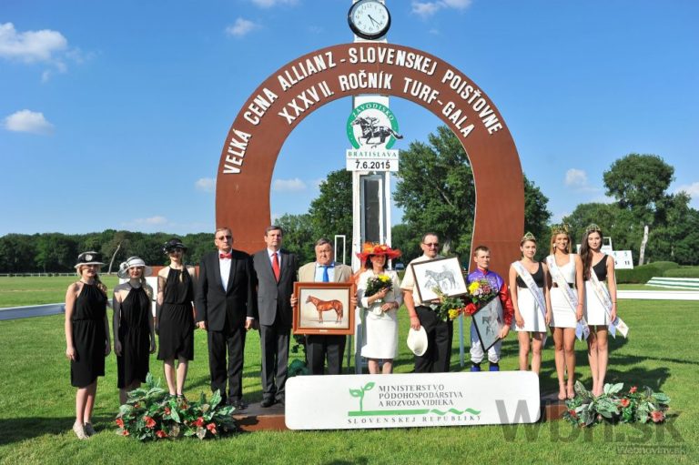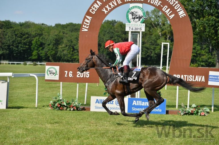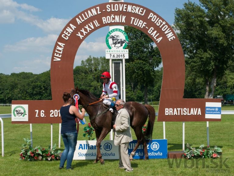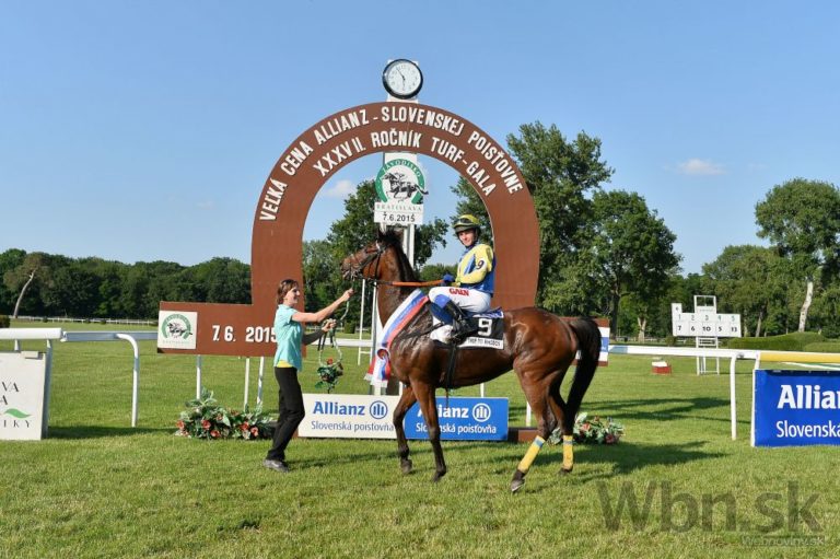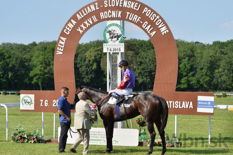Víťaz ceny Allianz - Slovenskej poisťovňe - 32. Veľká cena Slovenska (rovina 2400 m) kôň Trip to Rhodos (vľavo) počas 7. mítingu sezóny XXXVII. ročníka Turf-gala. Bratislava, 7. jún 2015 Foto: SITA/Robert Tappert