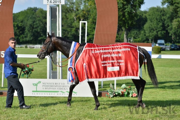 Víťaz Ceny Ministerstva pôdohospodárstva a rozvoja vidieka SR (rovina 1200 m) kôň Lord Patrick počas 7. mítingu sezóny XXXVII. ročníka Turf-gala. Bratislava, 7. jún 2015 Foto: SITA/Robert Tappert