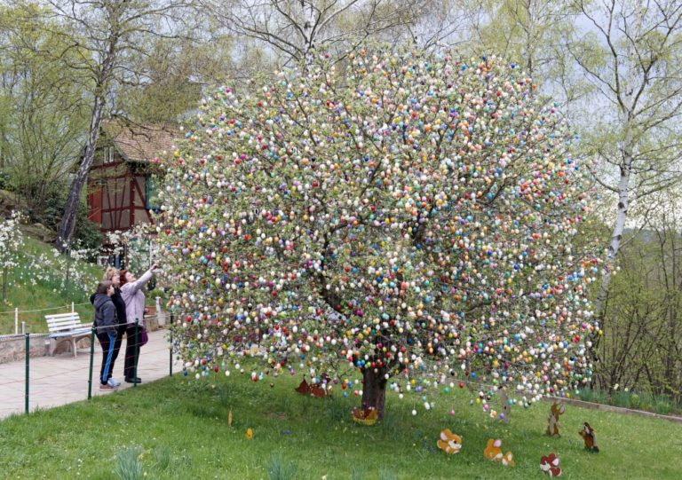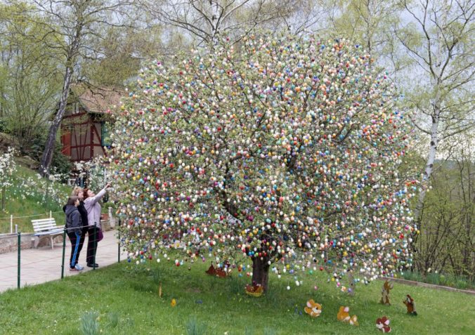 Jabloň vyzdobená s viac než desať tisíc maľovaných vajíčok. Tento unikátny skvost môžete vidieť v Saalfelde v Nemecku. Foto: SITA/AP