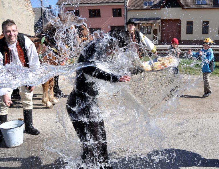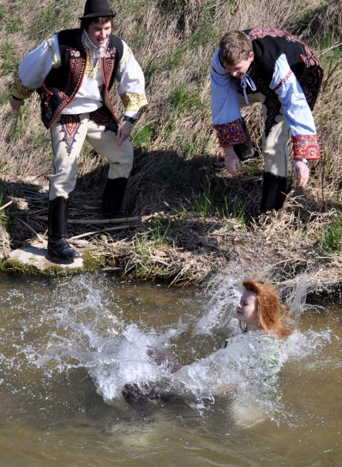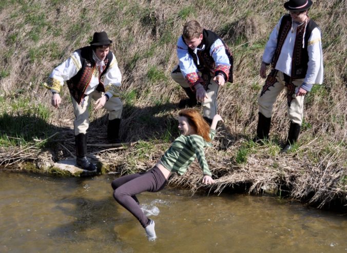 Kým niekto spí v teplej posteli, niekto iný letí do potoka. Tradičná oblievačka a šibačka na dedine v Trenčianskej Teplej (okr. Trenčín). Foto: SITA/Tomáš Somr