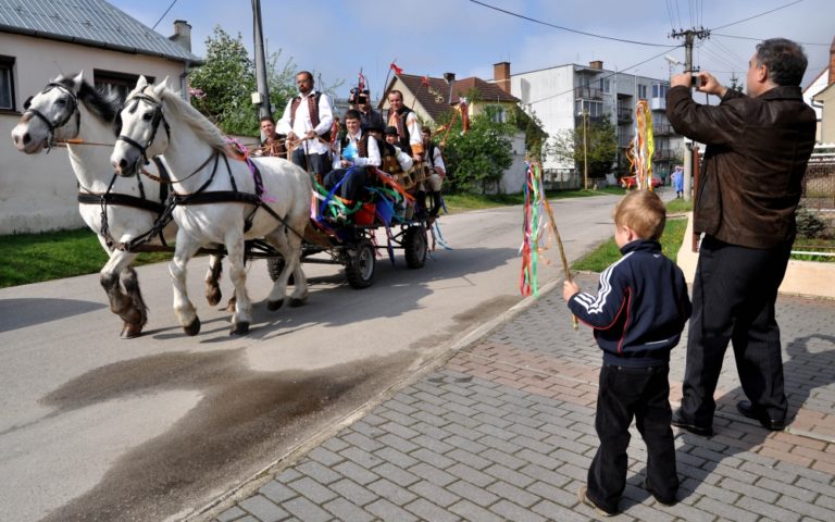 Koč zapriahnutý, korbáče upletené, môže sa ísť šibať. Chlapci na voze ťahanom koňmi navštevovali s korbáčmi a spevom domy dievčat, priateliek a známych v Trenčianskej Teplej (okr. Trenčín). Foto: SITA/Tomáš Somr