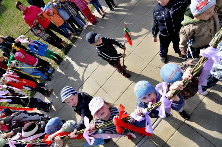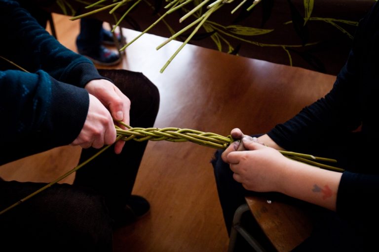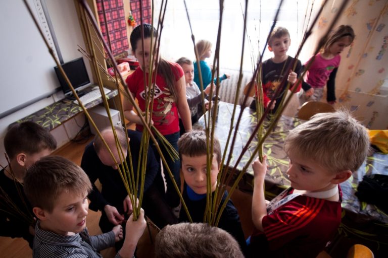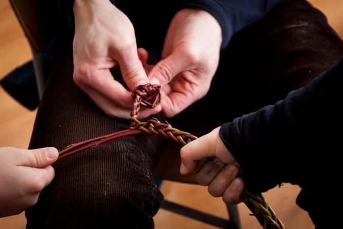 Kto nemá správne upletený korbáč, nie je správy šibač. Žiaci Základnej školy Kalinkovo pletú veľkonočné korbáče z prútia v rámci príprav na prichádzajúcu Veľkú noc. Foto: SITA/Diana Černáková