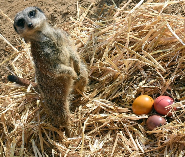 Veľkú noc má snáď rád každý. Výnimkou nie je ani táto malá Surikata z Hannoverskej zoo v Nemecku. Foto: SITA/AP