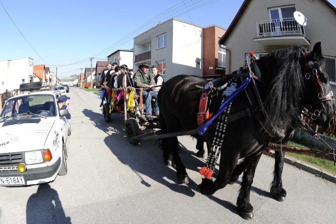 Chlapci v krojoch idú na voze počas tradičnej oblievačky a šibačky na Veľkonočný pondelok v obci Trenčianska Teplá. Trenčianska Teplá, 10. apríl 2023. Foto: SITA/Tomáš Somr.