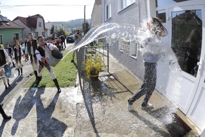 Chlapec v kroji polieva dievčatá počas tradičnej oblievačky a šibačky na Veľkonočný pondelok v obci Trenčianska Teplá. Trenčianska Teplá, 10. apríl 2023. Foto: SITA/Tomáš Somr.