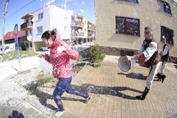 Chlapci v krojoch polievajú a šibú dievčatá počas tradičnej oblievačky a šibačky na Veľkonočný pondelok v obci Trenčianska Teplá. Trenčianska Teplá, 10. apríl 2023. Foto: SITA/Tomáš Somr.