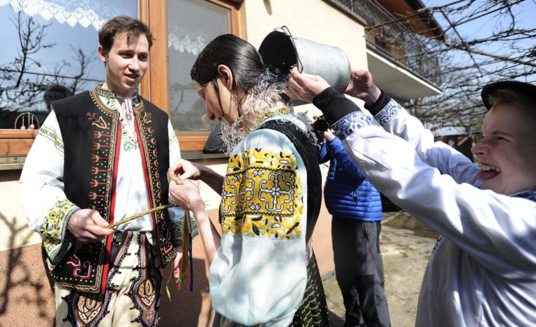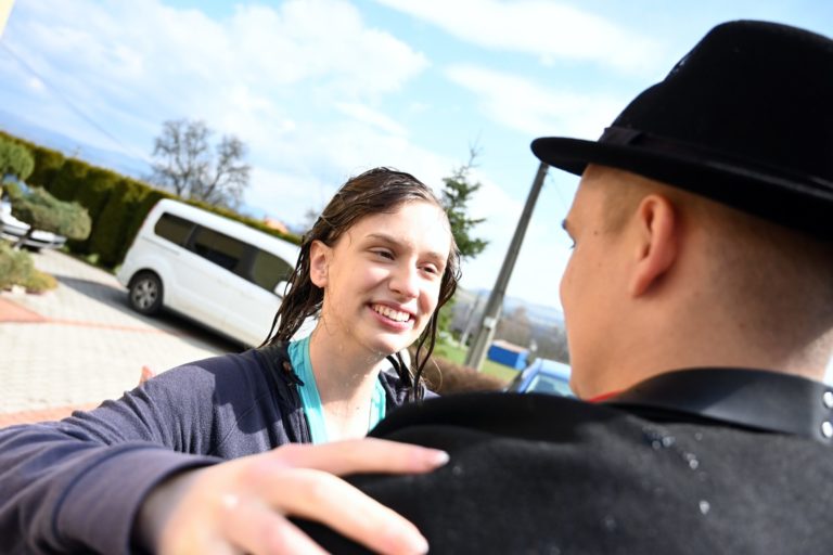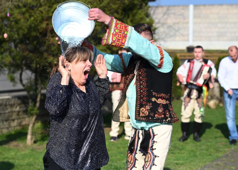 Chlapec v kroji polieva dievča počas tradičnej oblievačky a šibačky na Veľkonočný pondelok v obci Trenčianska Teplá. Trenčianska Teplá, 10. apríl 2023. Foto: SITA/Tomáš Somr.