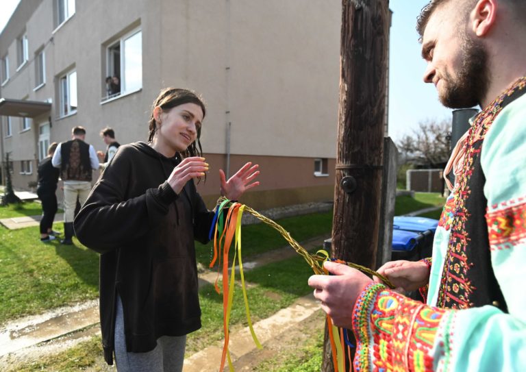 Dievča viaže stužku na korbáč počas tradičnej oblievačky a šibačky na Veľkonočný pondelok v obci Trenčianska Teplá. Trenčianska Teplá, 10. apríl 2023. Foto: SITA/Tomáš Somr.