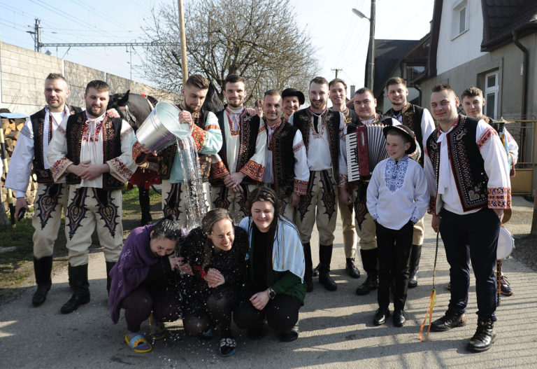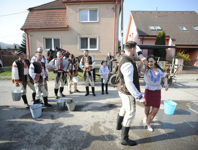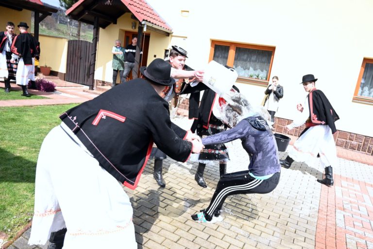 Chlapci v krojoch polievajú a šibú dievčatá počas tradičnej oblievačky a šibačky na Veľkonočný pondelok v obci Trenčianska Teplá. Trenčianska Teplá, 10. apríl 2023. Foto: SITA/Tomáš Somr.