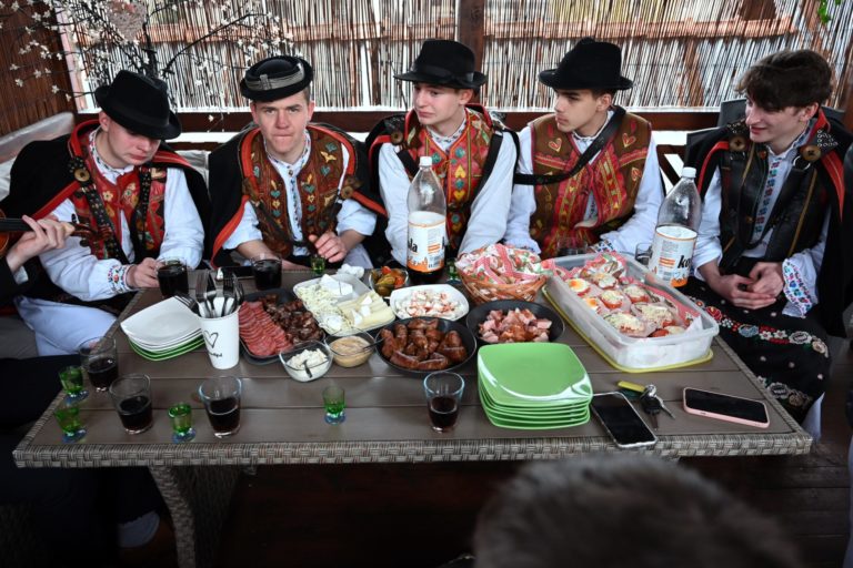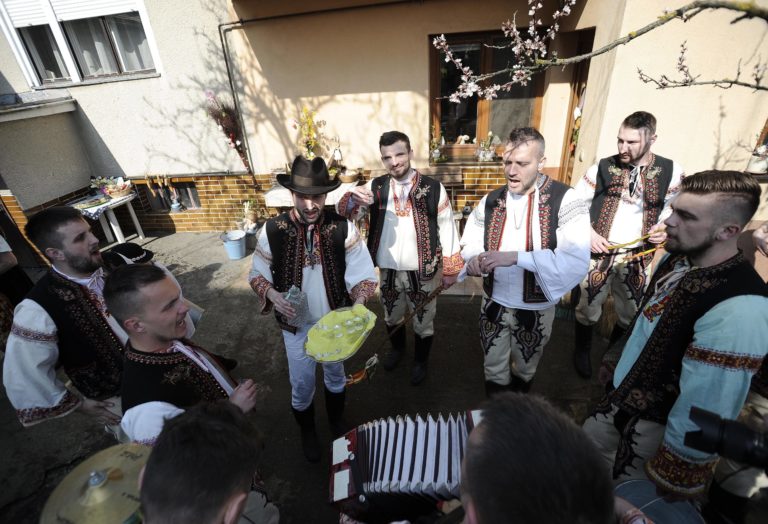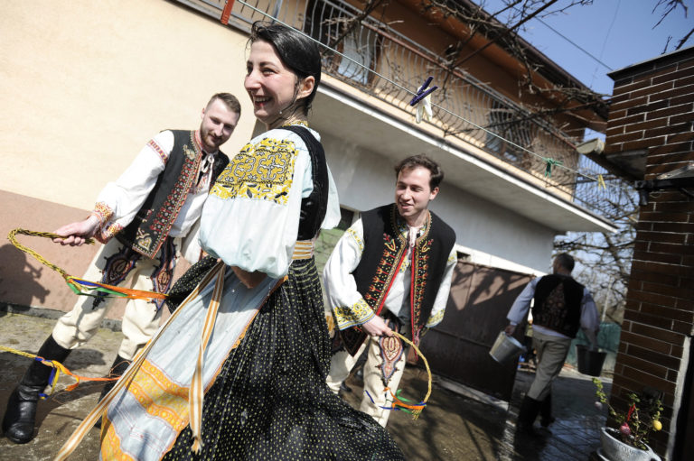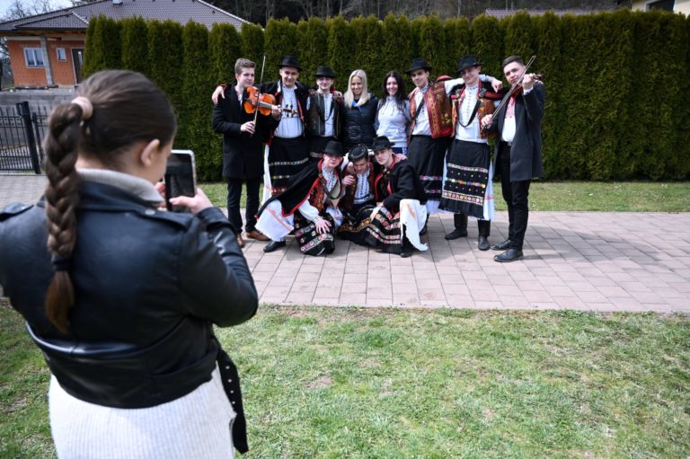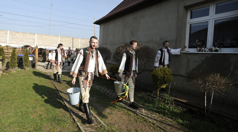 Členovia folklórneho súboru Podpoľanec počas tradičnej oblievačky a šibačky na Veľkonočný pondelok v Detve. Detva, 10. apríl 2023. Foto: SITA/Jakub Julény.