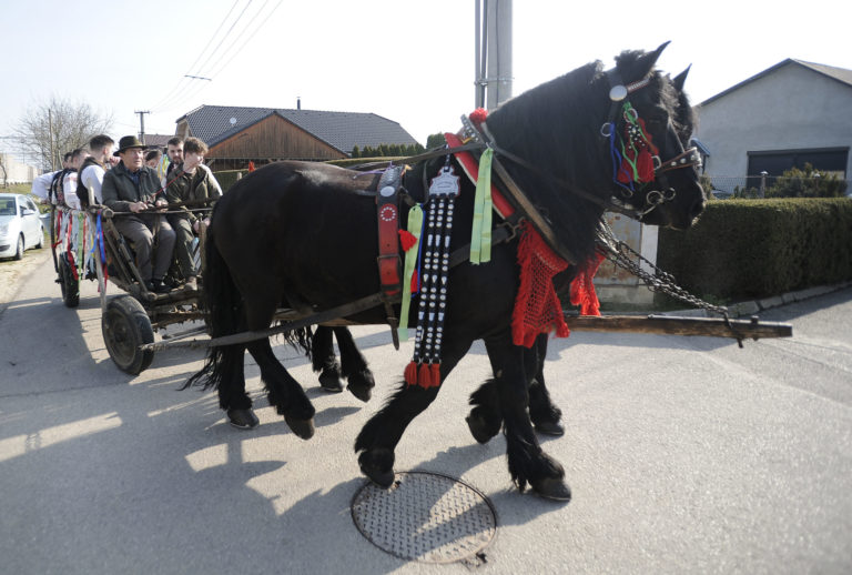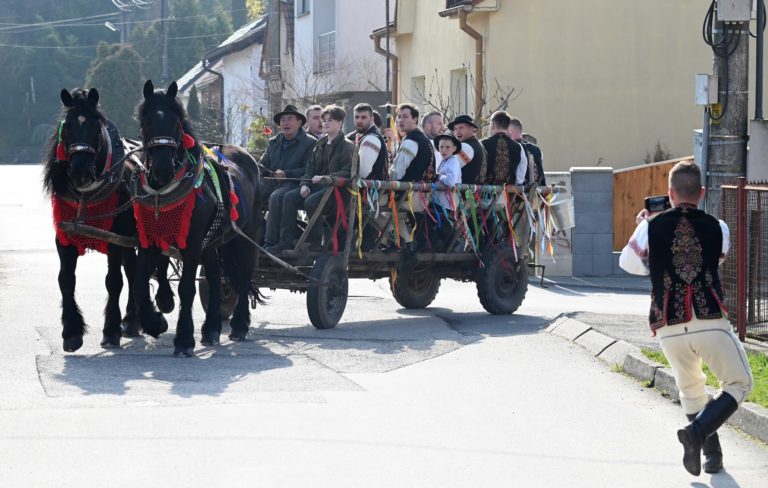 Chlapci v krojoch idú na voze počas tradičnej oblievačky a šibačky na Veľkonočný pondelok v obci Trenčianska Teplá. Trenčianska Teplá, 10. apríl 2023. Foto: SITA/Tomáš Somr.