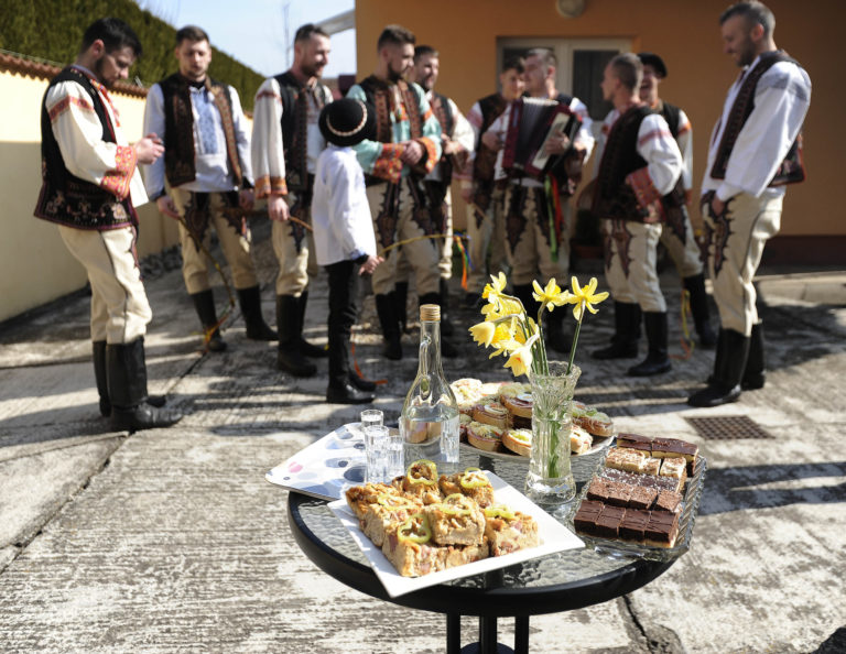 Dievčatá nalievajú pálenku a ponúkajú pohostenie počas tradičnej oblievačky a šibačky na Veľkonočný pondelok v Trenčianskej Teplej. Trenčianska Teplá, 10. apríl 2023. Foto: SITA/Tomáš Somr.