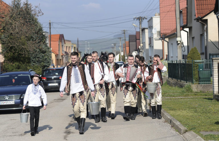 Chlapci v krojoch idú ulicou počas tradičnej oblievačky a šibačky na Veľkonočný pondelok v obci Trenčianska Teplá. Trenčianska Teplá, 10. apríl 2023. Foto: SITA/Tomáš Somr.