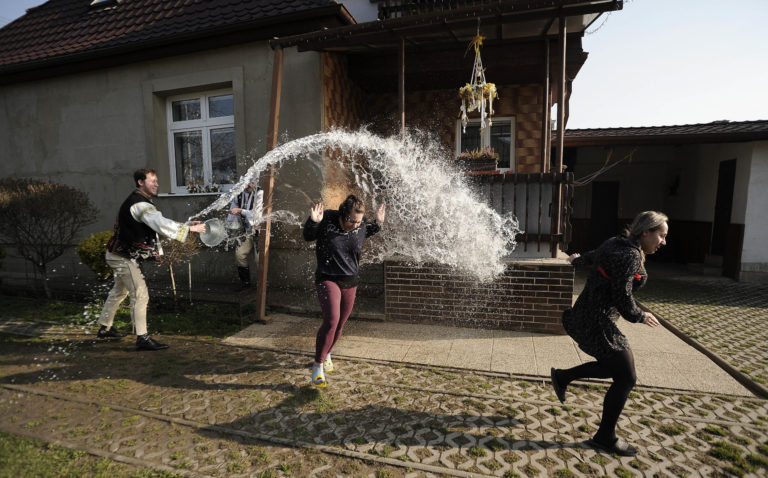 Chlapec v kroji polieva dievčatá počas tradičnej oblievačky a šibačky na Veľkonočný pondelok v obci Trenčianska Teplá. Trenčianska Teplá, 10. apríl 2023. Foto: SITA/Tomáš Somr.