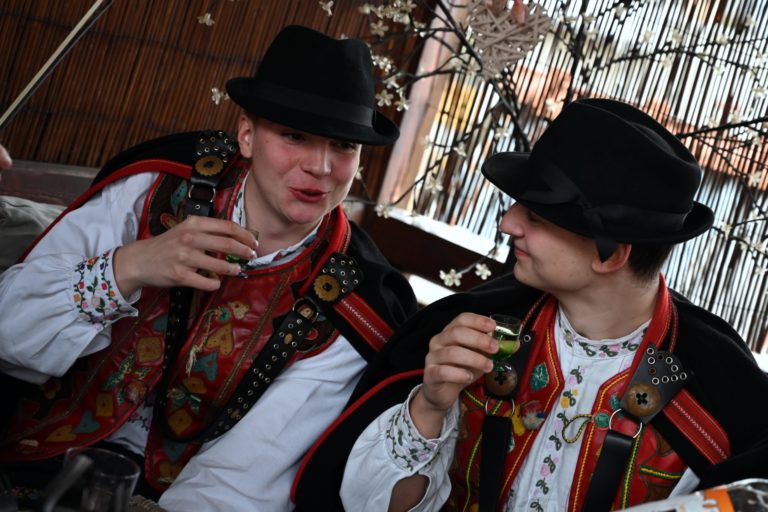 Chlapci v krojoch si pripíjajú počas tradičnej oblievačky a šibačky na Veľkonočný pondelok v obci Trenčianska Teplá. Trenčianska Teplá, 10. apríl 2023. Foto: SITA/Tomáš Somr.