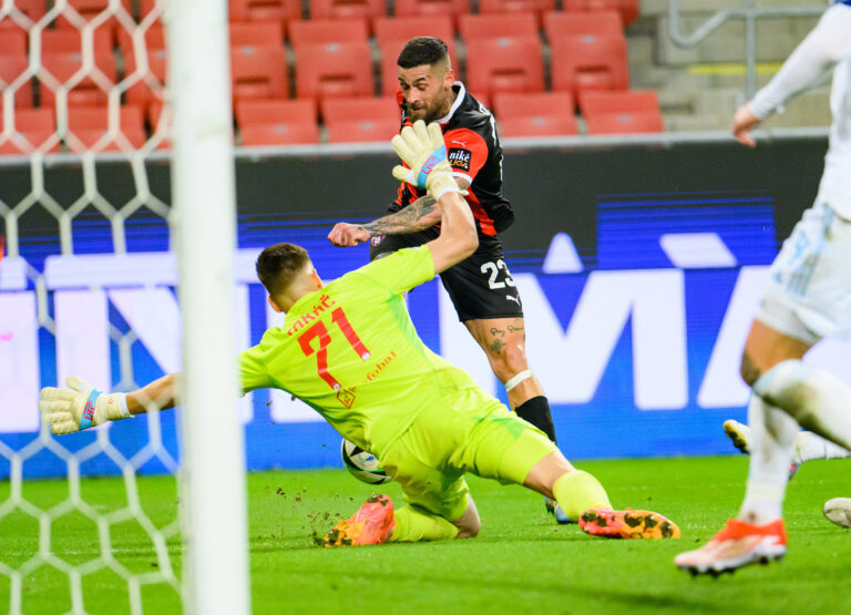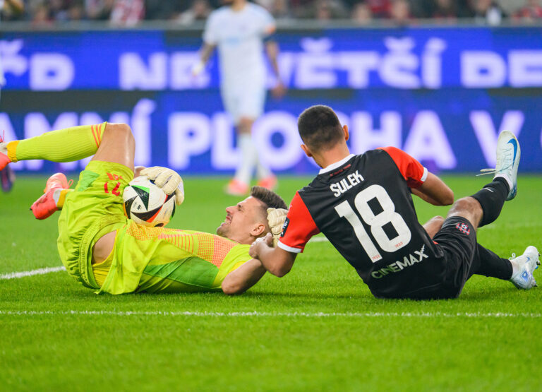 Sprava: Michal Ďuriš z FC Spartak Trnava a brankár Dominik Takáč z ŠK Slovan Bratislava počas futbalového zápasu 11. kola Niké ligy 2024/2025 medzi FC Spartak Trnava - ŠK Slovan Bratislava. Trnava, 19. október 2024. Foto: SITA/Martin Havran