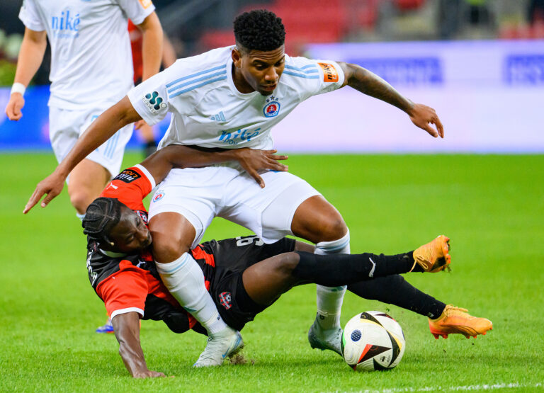 Kelvin Ofori z FC Spartak Trnava (dole) a Cesar Rodolfo Blackman Camarena z ŠK Slovan Bratislava (hore) počas futbalového zápasu 11. kola Niké ligy 2024/2025 medzi FC Spartak Trnava - ŠK Slovan Bratislava. Trnava, 19. október 2024. Foto: SITA/Martin Havran