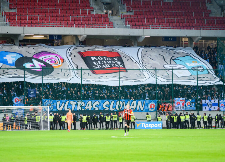 Sektor fanúšikov ŠK Slovan Bratislava počas futbalového zápasu 11. kola Niké ligy 2024/2025 medzi FC Spartak Trnava - ŠK Slovan Bratislava. Trnava, 19. október 2024. Foto: SITA/Martin Havran