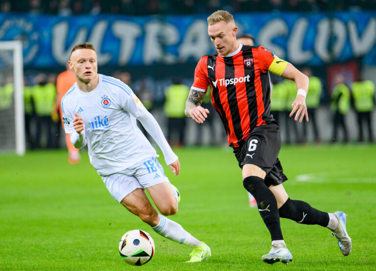 Zľava: Roman Prochádzka z FC Spartak Trnava a Idjessi Yethro Metsoko z ŠK Slovan Bratislava počas futbalového zápasu 11. kola Niké ligy 2024/2025 medzi FC Spartak Trnava - ŠK Slovan Bratislava. Trnava, 19. október 2024. Foto: SITA/Martin Havran