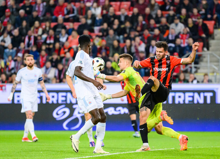 Sprava: Erik Daniel z FC Spartak Trnava a brankár Dominik Takáč z ŠK Slovan Bratislava počas futbalového zápasu 11. kola Niké ligy 2024/2025 medzi FC Spartak Trnava - ŠK Slovan Bratislava. Trnava, 19. október 2024. Foto: SITA/Martin Havran