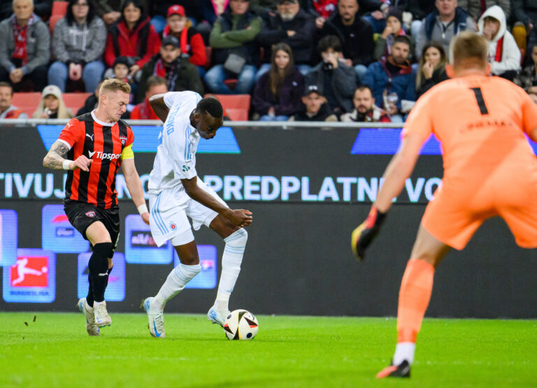 Roman Prochádzka z FC Spartak Trnava (uprostred) a Idjessi Yethro Metsoko z ŠK Slovan Bratislava (vľavo) počas futbalového zápasu 11. kola Niké ligy 2024/2025 medzi FC Spartak Trnava - ŠK Slovan Bratislava. Trnava, 19. október 2024. Foto: SITA/Martin Havran