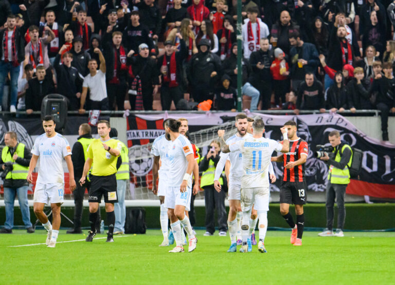 Gólová radosť hráčov ŠK Slovan Bratislava počas futbalového zápasu 11. kola Niké ligy 2024/2025 medzi FC Spartak Trnava - ŠK Slovan Bratislava. Trnava, 19. október 2024. Foto: SITA/Martin Havran